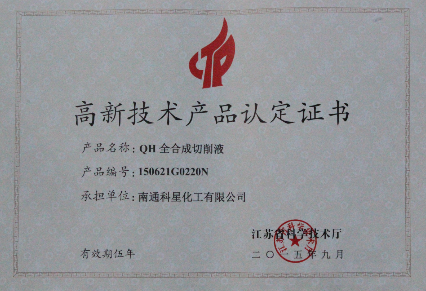 我公司QH全合成切削液榮獲省高新技術(shù)產(chǎn)品。該產(chǎn)品是一種新型環(huán)保高效切削液,與目前市場所用切削液產(chǎn)品相比較,具有更先進的技術(shù)水平,完全達到油性乳化液產(chǎn)品性能。使用周期長,管理得當,長期使用無需更換槽液。有著優(yōu)良的潤滑極壓性、冷卻性,防銹性、沉降性、油水分離性和清洗性等性能,工作液清澈透明,適用范圍廣,適合各種金屬材料的生產(chǎn)加工工藝。