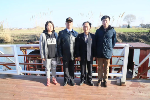 南通科星化工股份有限公司董事長吳龍鐵(中)和執行總裁吳曉強(右一)、海安玖玖玖貿易有限公司總經理丁穩玲(左一)以及張云泉同志(左二)一起慰問參加過抗美的老兵顏夕林(右二)