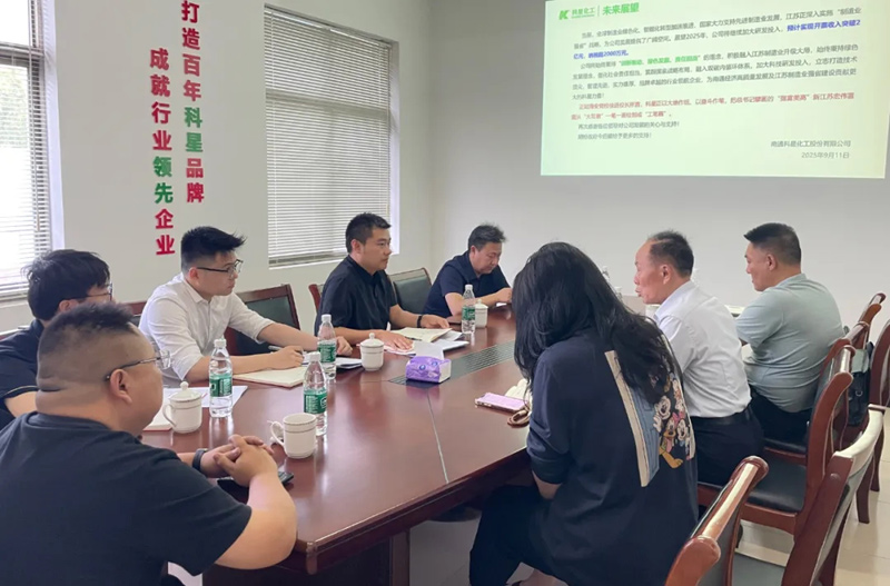 2025年9月11日下午,南通市發(fā)改委經(jīng)濟運行調(diào)節(jié)處處長王帥軍,四級主任科員俞榮、姬一峰,海安市發(fā)改委黨組副書記、副主任楊成龍,白甸鎮(zhèn)副鎮(zhèn)長郭勇及經(jīng)發(fā)辦相關(guān)負責人蒞臨南通科星化工股份有限公司開展走訪調(diào)研工作。此次調(diào)研旨在深入了解企業(yè)發(fā)展現(xiàn)狀,傾聽企業(yè)需求,為企業(yè)排憂解難,助力企業(yè)高質(zhì)量發(fā)展??菩嵌麻L吳龍鐵及副總經(jīng)理劉小燕在工廠行政樓會議室熱情接待了來訪領(lǐng)導(dǎo),并進行了深入交流。